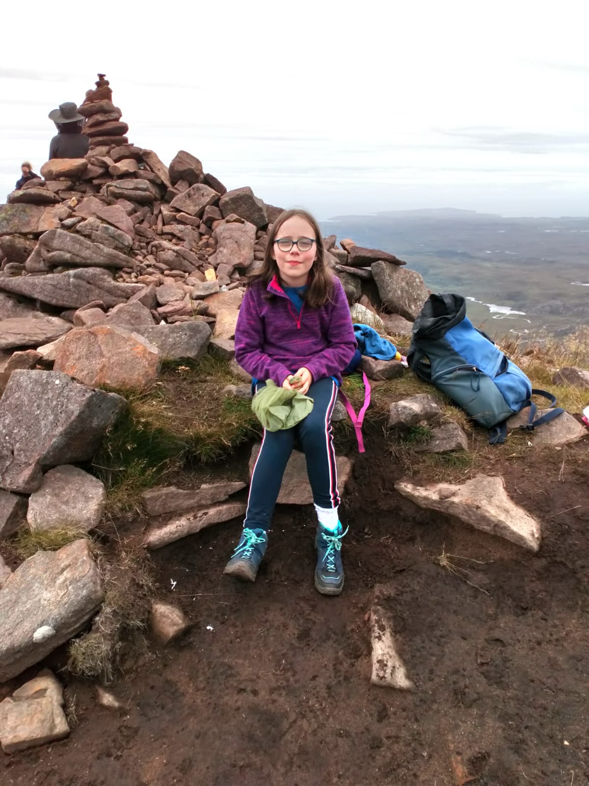 We got up early and arrived in the car park just after 8.30 am. We followed the track for 5 km u TIL we cam to a footbridge. A little further on, past the small loch, amazingly we saw an added basking in the sun. I’ve never seen an adder in real life before. I was a little bit frightened. We began the arduous climb up the steepest part of the mountain. Breathing hard we scrambled to the summit. Breathless and elated we stood on the top. There wasn’t a breath of wind so the midges were on the attack. Luckily they preferred dad to me. Descending was hard on my knees but easier than going up. The walk back seemed to last years. Exhausted we arrived back at the car park.